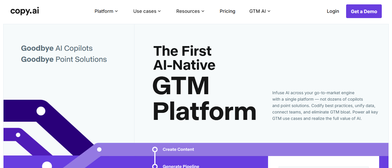 Copy.ai is an AI-powered content and go-to-market (GTM) automation platform designed to help teams generate marketing, sales, and business content. It supports use cases such as blog writing, email campaigns, product descriptions, and outbound messaging. The platform combines AI text generation with workflow automation, allowing users to create and manage content across multiple channels. It is typically used by marketing teams, sales teams, and startups to speed up content production and reduce manual writing effort.