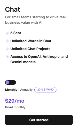 Copy.ai follows a freemium model. A free plan is available with limited access to features and usage. Paid plans start at approximately $29 per month and include expanded usage, unlimited words in chat, and collaboration features. Enterprise plans are also available with custom pricing and additional controls. Pricing details and limits may change, so users should check the official site for the latest information.