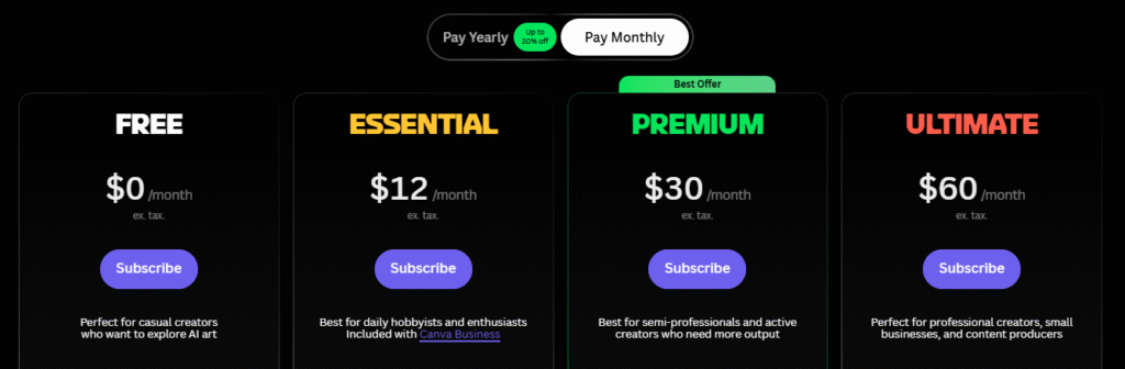 Paid plans start at around $12/month, with higher tiers available for increased token limits, faster processing, private generations, and access to advanced features such as video generation and model customization.